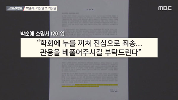 소명서에 밝혔듯 당시 박순애는 행정학회가 정치학회에 자신의 논문에 대해 중복 게재를 통보한다는 사실을 알고 있었다. <스트레이트>는 이때 행정학회가 정치학회에 보낸 '공문'도 입수했다. 즉, 자진 철회했다는 박순애의 해명은 거짓이다. 또한 박순애는 자신의 잘못을 시인하며 선처를 호소했습니다. 지금껏 "자진 철회를 했기 때문에 투고 금지 징계를 받은 줄도 몰랐다"던 주장과 맞지 않는 태도이다. 그리고 중복 게재에 대한 규정이 만들어진 건 2005년이라고 스스로 주장해 놓고 지금은 2015년에 규정이 만들어져 문제가 없다고 한다.