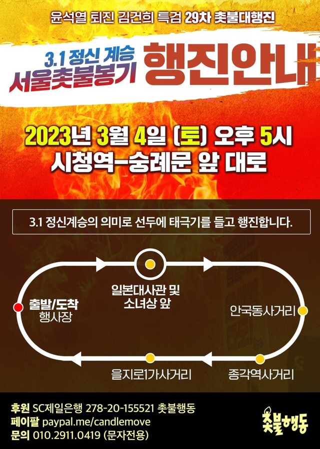 한편, 전국촛불봉기와 함께하는 29차 촛불대행진은 3월 4일 토요일 오후 5시 시청역-숭례문 앞 대로에서 행진을 시작해 일본대사관 및 소년상과 안국동사거리, 종각역사거리, 을지로1가사거리를 지나 시청역-숭례문 앞에 도착하게 됩니다.
