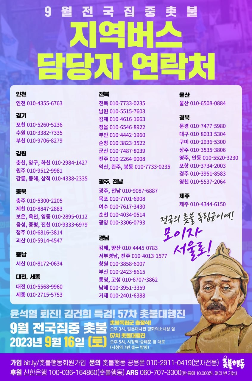 지역모집버스 담당자 연락처도 있으니 해당 지역에서 9월 전국집중촛불에 참석하시고 싶으신 전국의 촛불독립군께서는 많은 연락 부탁드립니다.