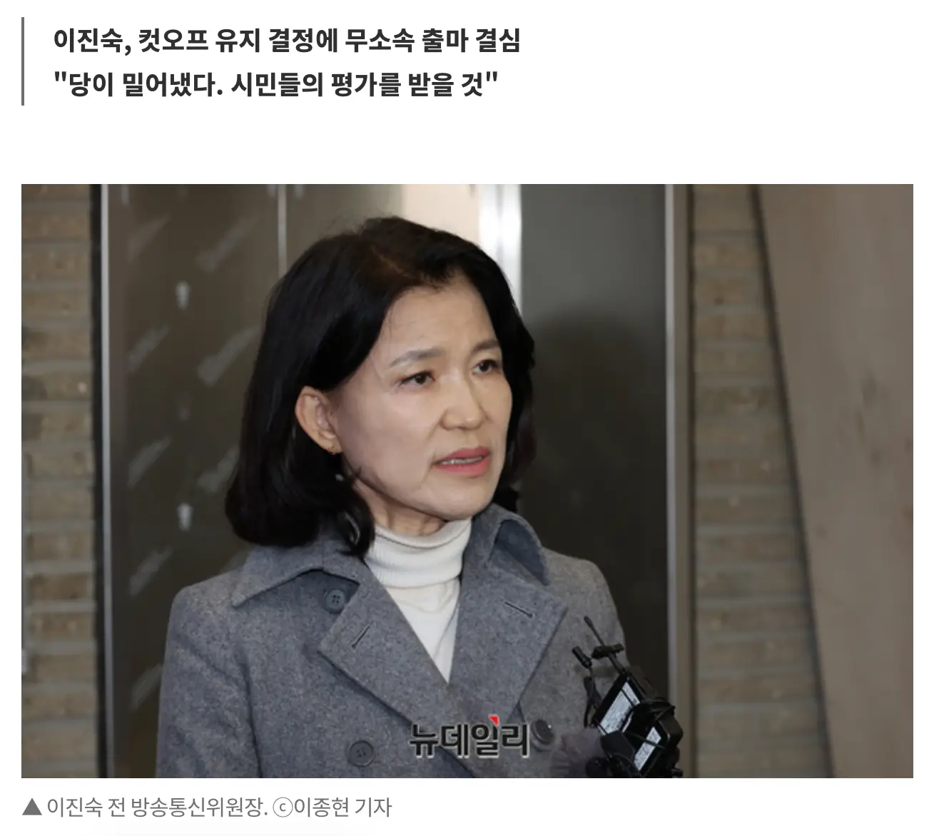 2026년 4월 3일 뉴데일리 보도에 따르면 이진숙 전 방송통신위원장은 "당이 나를 밀어내고 있으니 밀려나가는 수밖에 없지 않느냐. 내가 당을 떠나는 것이 아니라 당이 나를 밀어내는 것이다"라며 무소속 출마를 결심했다고 한다.