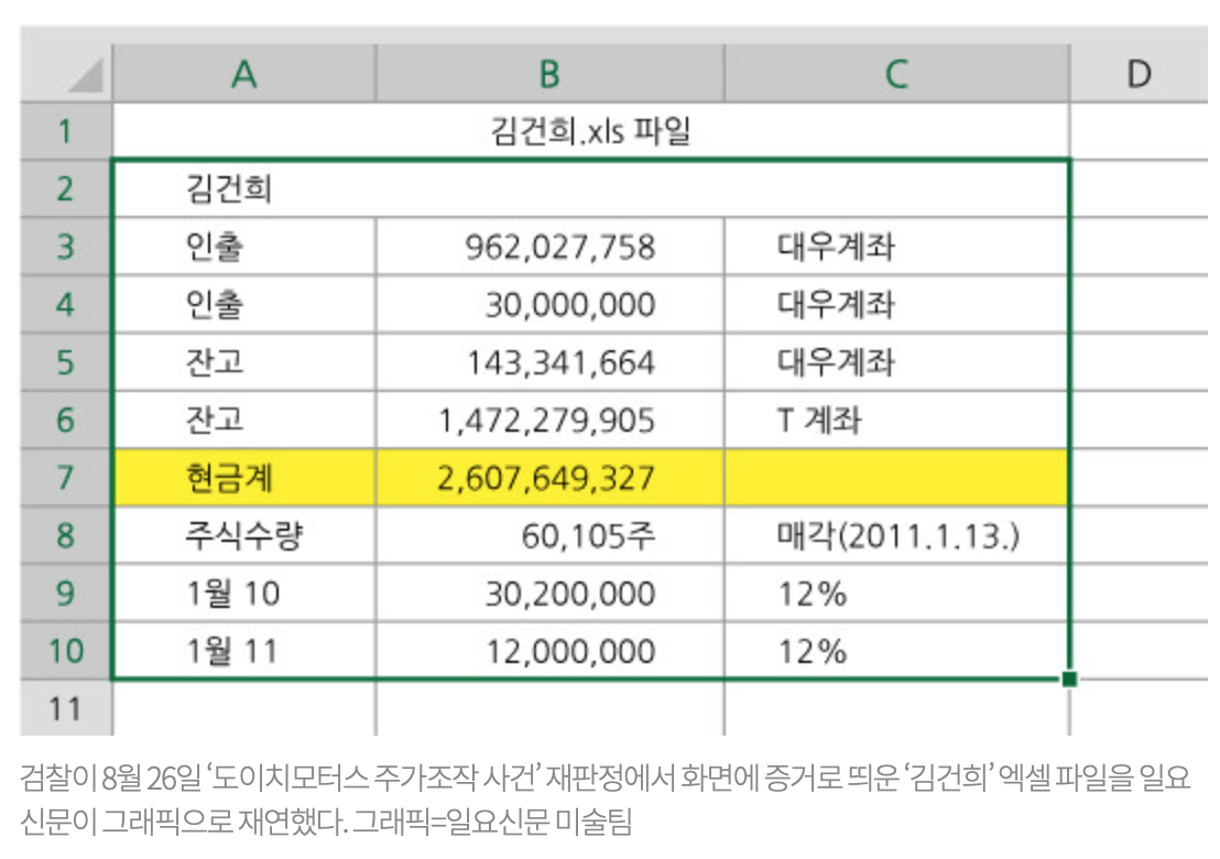 2021년 9월 초 도이치모터스 주가조작 사건을 수사하던 검찰은 도이치모터스 주가조작 2차 작전 주범으로 구속 기소된 B인베스트 대표의 사무실을 압수수색했고, 이 당시 압수 물품인 노트북에서 '김건희'로 돼 있는 엑셀 파일을 나왔다. 이런 사실은 2022년 4월 8일 열린 도이치모터스 주가조작 사건 공판에서 공개됐다.