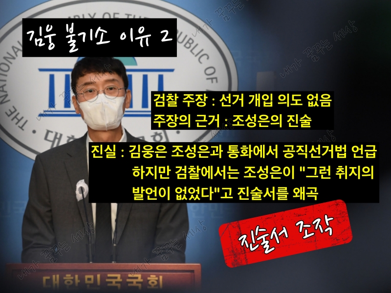 검찰이 조성은의 진술을 왜곡한 이유는 대화 녹음 파일 등을 통해 '선거에 영향을 미칠 의도'가 적나라하게 드러난 상황에서 이를 부인하기 위한 것으로 풀이된다. 조성은의 진술을 왜곡해 김웅을 불구속 기소 이유로 삼았다면 이 또한 허위공문서 작성으로 사건 조작에 해당될 수 있다.