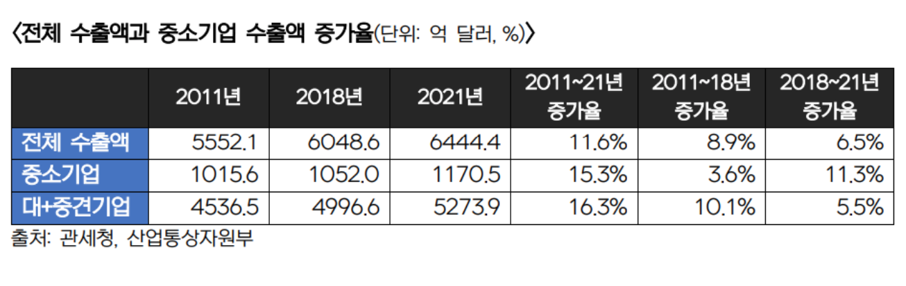그런데 2018~2021년 수출 증가율을 보면 극적인 변화가 보인다. 전체 증가율이 6.5%였고, 중소기업 수출 증가율은 11.3%였던 반면, 대기업과 중견기업의 수출 증가율은 절반도 되지 않는 5.5%에 불과하였다. 중소기업 주도로 수출 구조가 변화하고 있는 것이다.
