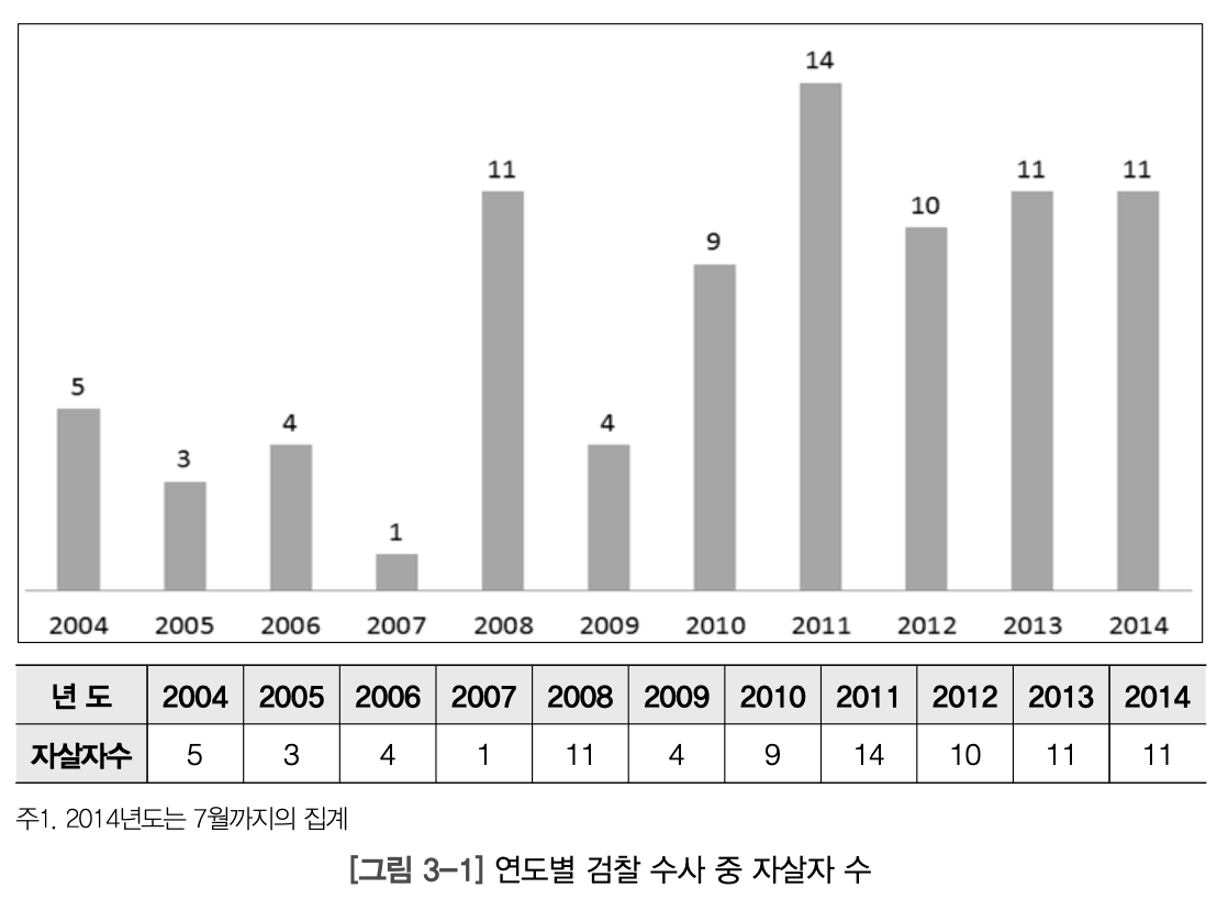 2014년 한국형사정책연구원에서 발간한 '검찰 수사 중 피조사자의 자살 발행 원인 및 대책 연구'에 따르면, 2004년부터 2014년 상반기까지 검찰 수사 중 자살자 수는 83명에 이른다. 특히 2011년부터는 매년 10명 이상이 검찰 수사 중 극단적 선택을 한다.