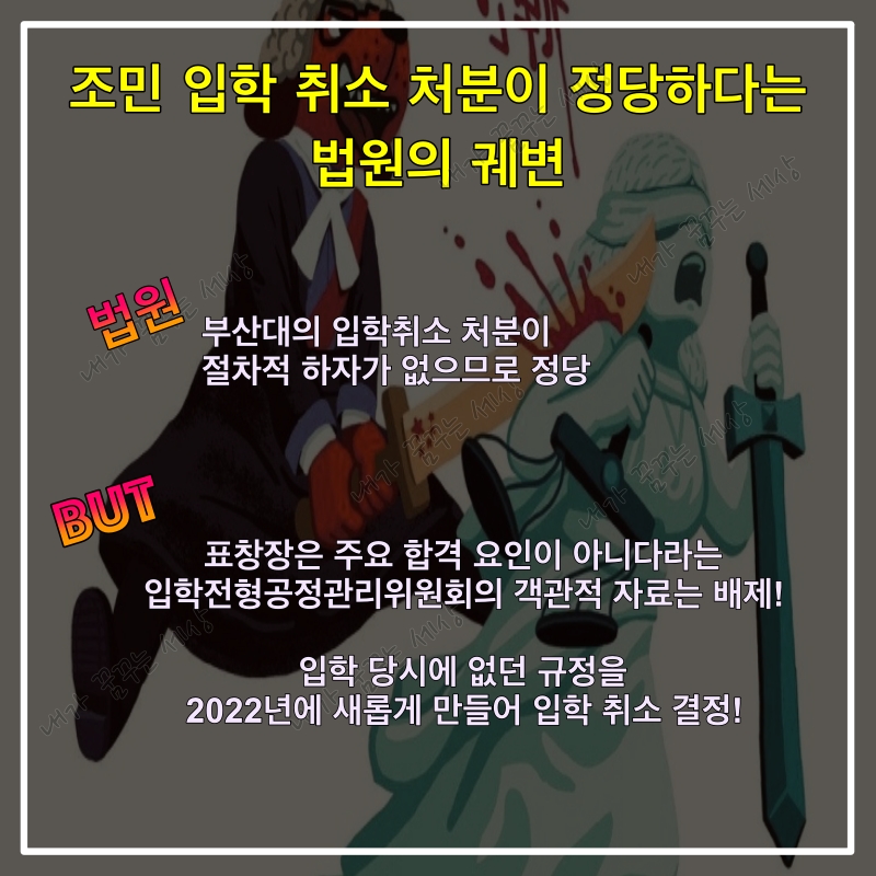 우선, 앞에서도 설명했듯이 부산대가 입학허가를 취소할 당시 입학전형공정관리위원회의 객관적 자료는 배제하였으며, 당시에 없던 규정을 2022년에 새롭게 만들어 2015년에 있었던 일에 대한 입학허가 취소를 내렸음에도 불구하고 절차적 하자가 없다고 판단했다.