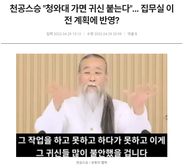 천공과 윤석열의 무속 논란은 윤석열이 대통령이 된 이후에도 끊이질 않았다. 특히 아무도 돌려달라고 하지 않았는데 굳이 청와대를 나와 용산으로 이전한 것에 천공이 개입되었다는 의혹에 실제 관련자의 증언이 나오면서 천공과 윤석열의 무속 논란은 의혹이 아닌 사실로 밝혀지고 있다.