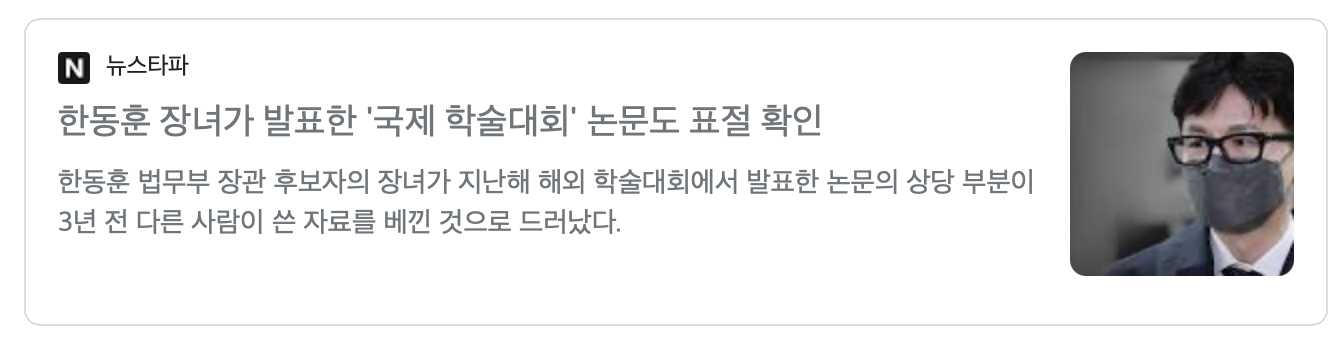 아래 글은 2022년 5월 7일 뉴스타파 「한동훈 장녀가 발표한 '국제 학술대회'눈문도 표절 확인」 기사 글입니다.