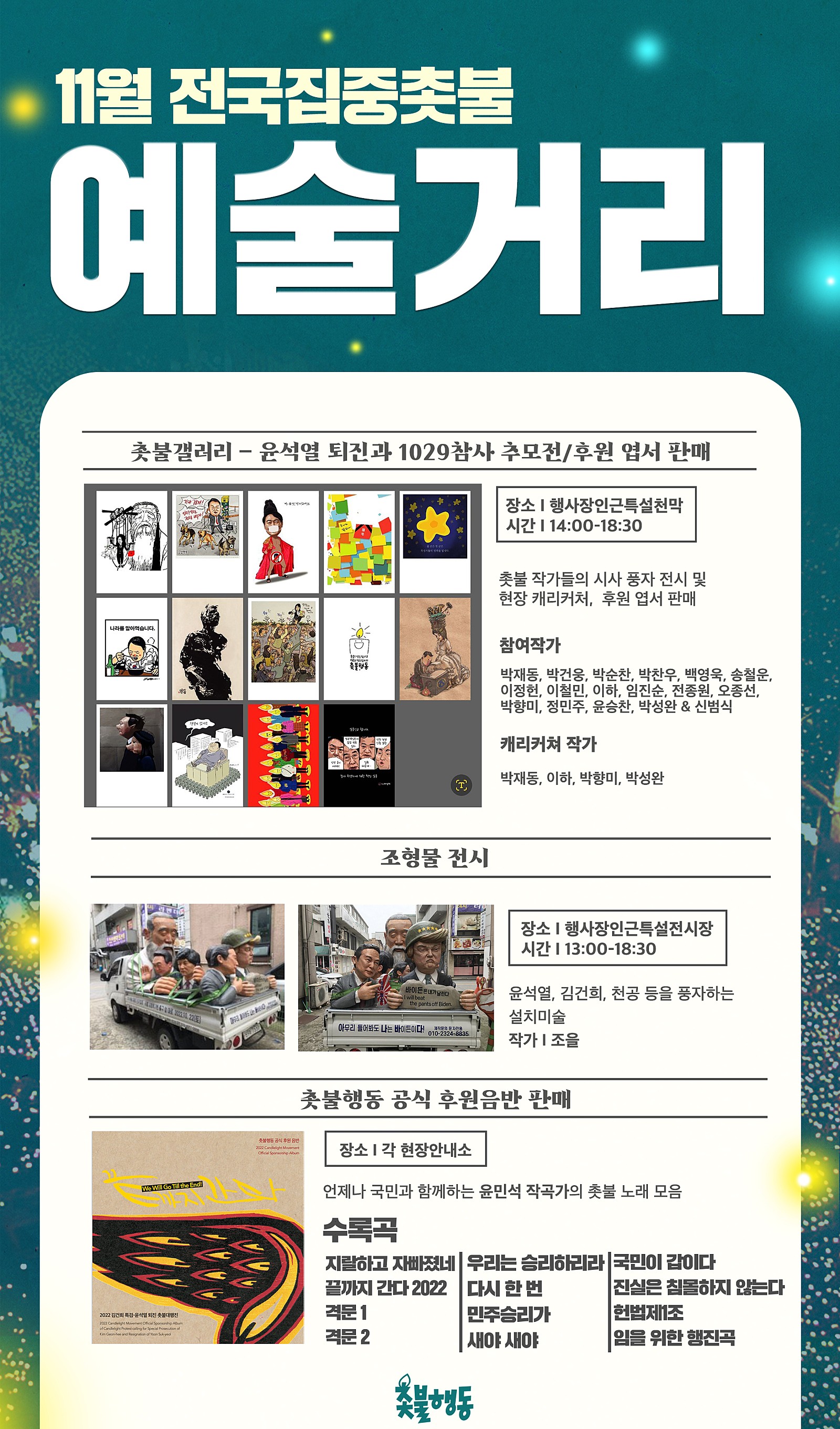 오후 2시부터 행사장 인근 특설 천막에서 촛불 갤러리가 열립니다. 이곳에서는 윤석열 퇴진과 1029 참사 추모전과 함께 후원엽서판매도 같이  진행됩니다. 이날 행사에는 박재동, 박건웅, 박순찬, 박찬우, 백영욱, 송철운, 이정헌, 이철민, 이하, 임진순, 전종원, 오종선, 박향미, 정민주, 윤승찬, 박성완, 신범식 작가님들의 작품을 관람할 수 있습니다.