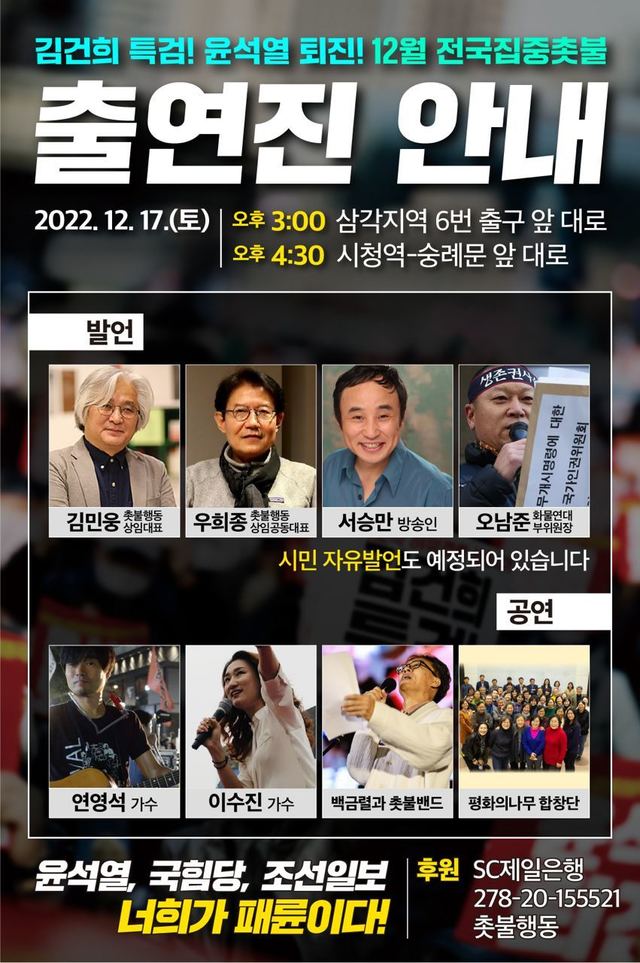 2022년 12월 17일 토요일 시청역-숭례문 앞 대로에서 💥김건희 특검! 윤석열 퇴진!💥18차 촛불대행진이 진행됩니다.