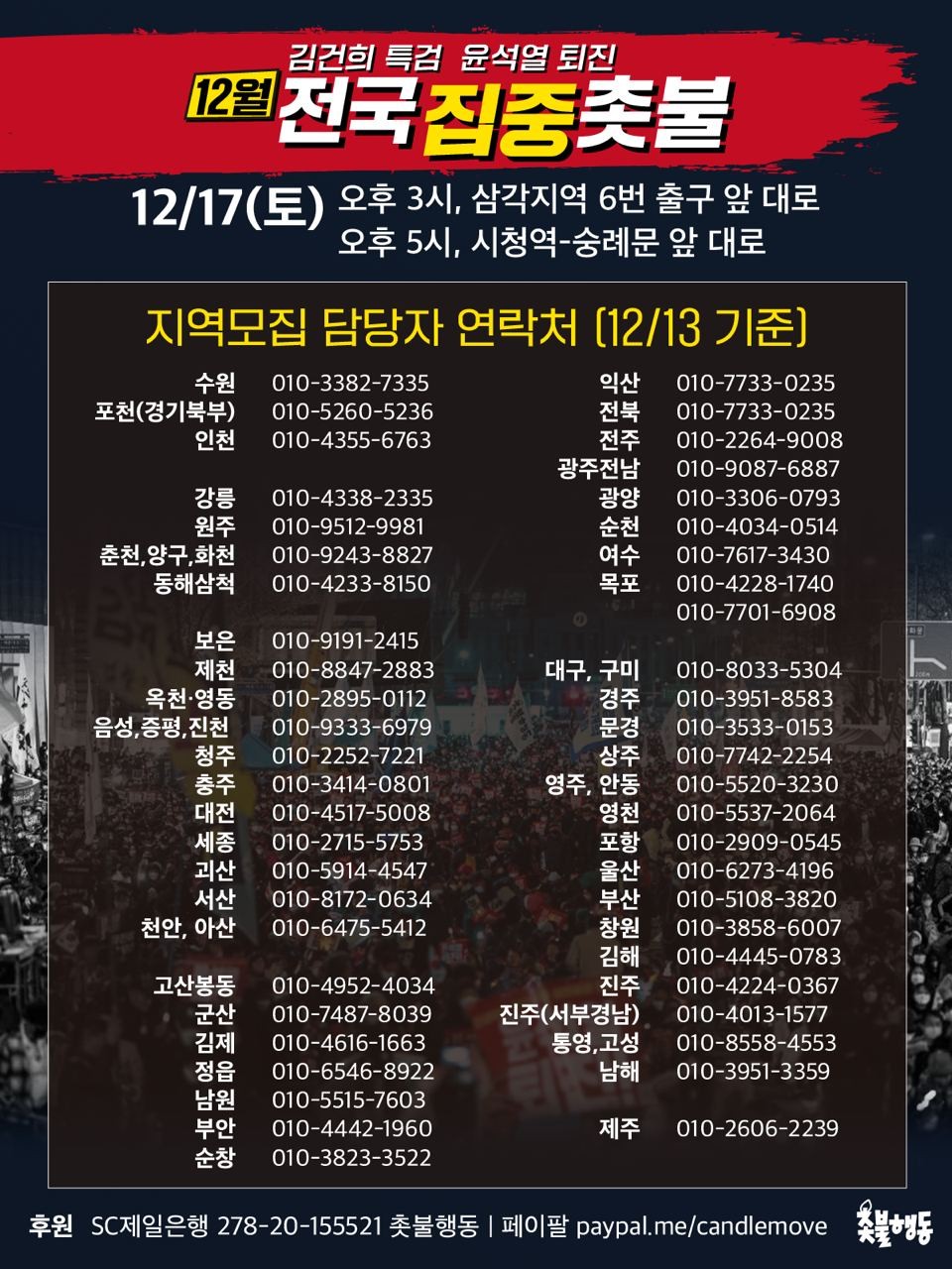 한편, 12월 전국집중촛불에는 김민웅(촛불행동 상임대표), 우희종(촛불행동 상임공동대표), 서승만(방송인), 오남준(화물연대 부위원장)의 발언과 가수 연영석, 가수 이수진, 백금렬과 촛불밴드, 평화의 나무 합창단의 공연이 예정되어 있습니다.