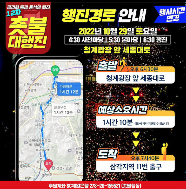 ▶ 행진코스 : 삼각지역까지 행진(6시30분 청계광장 앞 세종대로를 출발해 7시40분 삼각지역 11번 출구 도착 예정입니다)