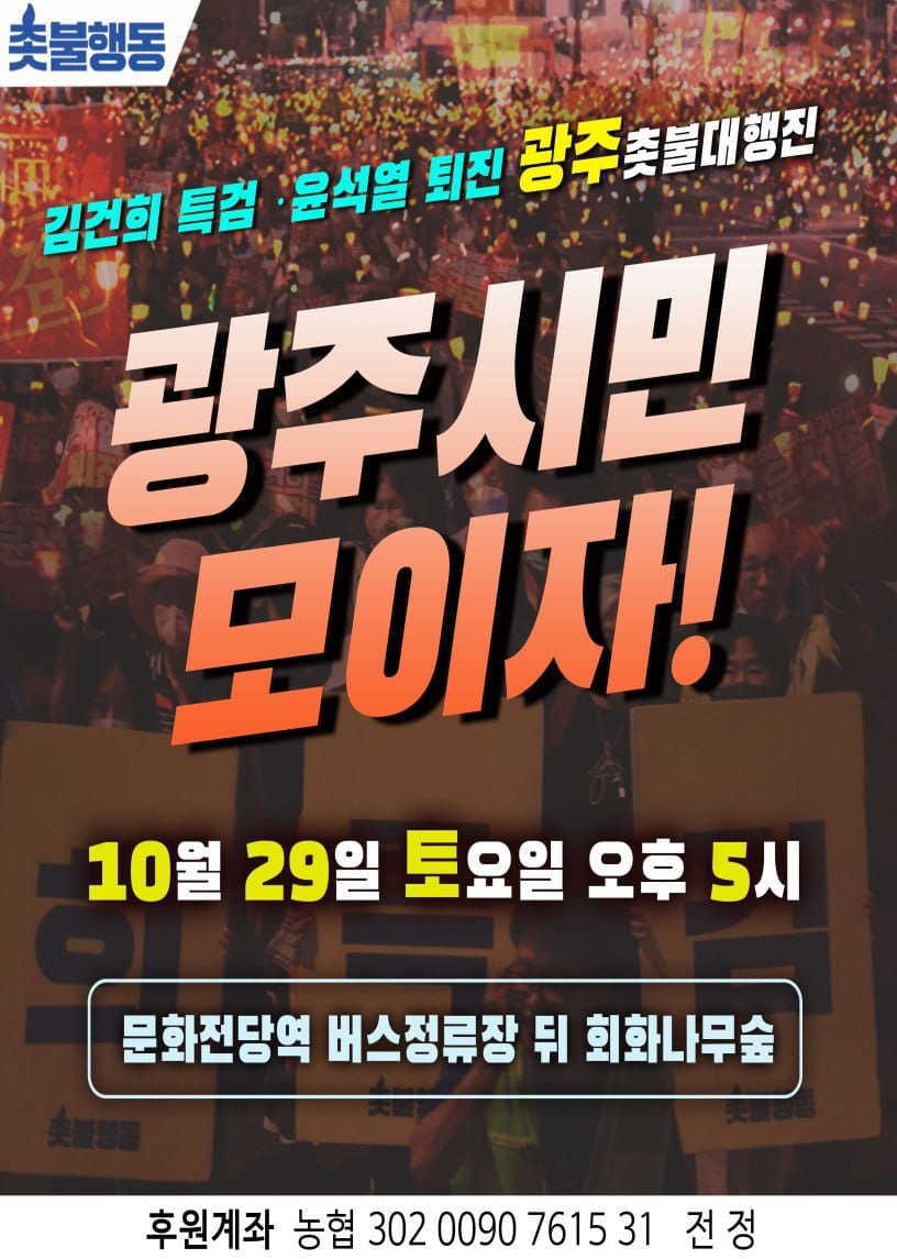 10월 29일 토요일 오후 5시 광주광역시 문화전당역 버스정류장 뒤 회화나무숲에서 김건희 특검·윤석열 퇴진 광주 촛불대행진이 진행됩니다.
