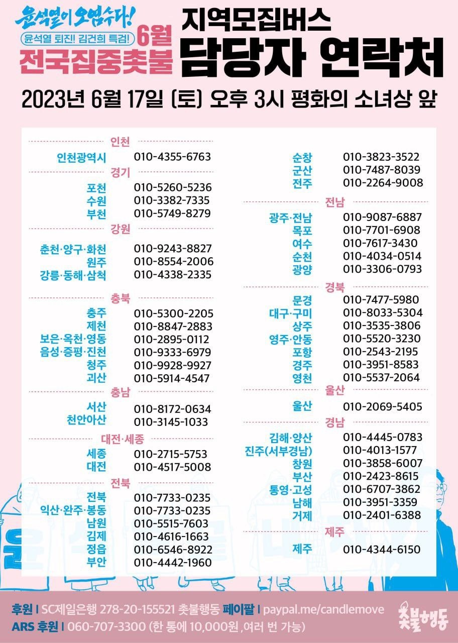 지역모집버스 담당자 연락처도 있으니 해당 지역에서 6월 전국집중촛불에 참석하시고 싶은 분들의 많은 관심 부탁드립니다.