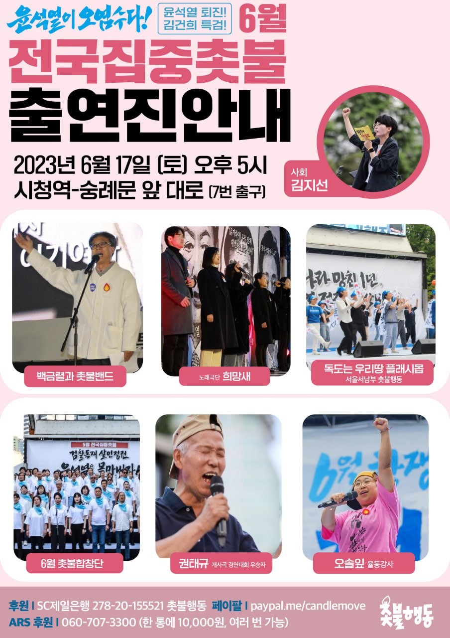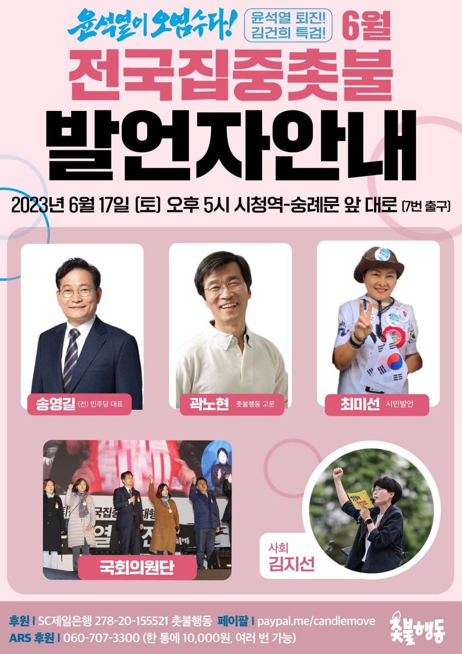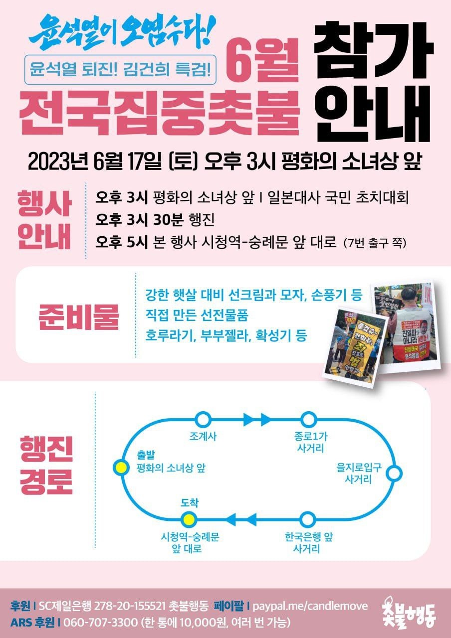 2023년 6월 17일 토요일 오후 5시 시청역-숭례문 앞 대로에서 💥윤석열이 오염수다💥 6월 전국집중촛불 본 행사가 진행됩니다.