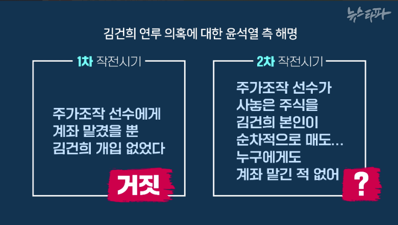 앞에서 소개한 뉴스타파의 기사( '도이치 2차 작전 사무실서 '김건희 파일'나왔다' )에서는 김건희는 1차 작전 시기에 주가조작 주범 격인 이 씨에게 계좌와 주식을 맡겼지만 직접 개입하지 않았기 때문에 그 시기 주가 조작이 있었다 해도 김건희와 무관하며, 2차 작전 시기에 김건희가 도이치모터스 주식을 거래한 것은 사실이지만 김건희가 직접 전화로 주문했으며 누군가에게 계좌를 맡긴 사실이 없으므로 주가조작 세력과 무관하다고 윤석열 측의 해명을 정리했다.