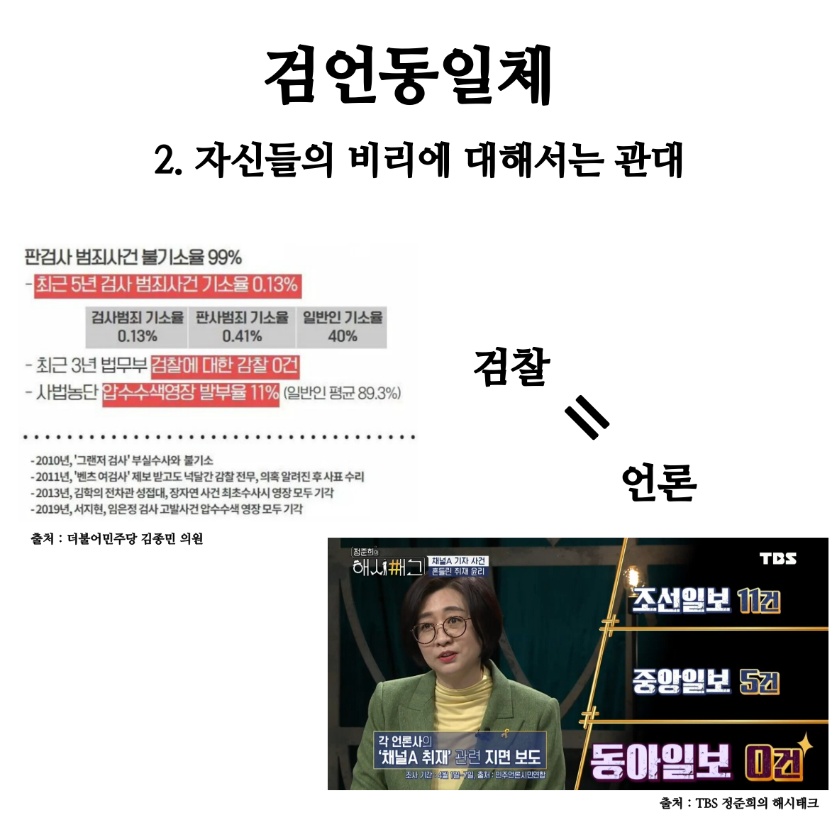 최근 사단법인 법조언론인클럽(회장 박민 문화일보 편집국장)이라는 단체가 11월 17일 발표한 법조 출입기자들을 대상으로 한 설문조사결과로 기자와 검사가 한 몸이나 다름 없는 ‘검언 동일체의 괴물적 존재’임을 실증해주었으며, '검언동일체'라는 신조어도 만들어 냈다(굿모닝 충청, 정문영기자)