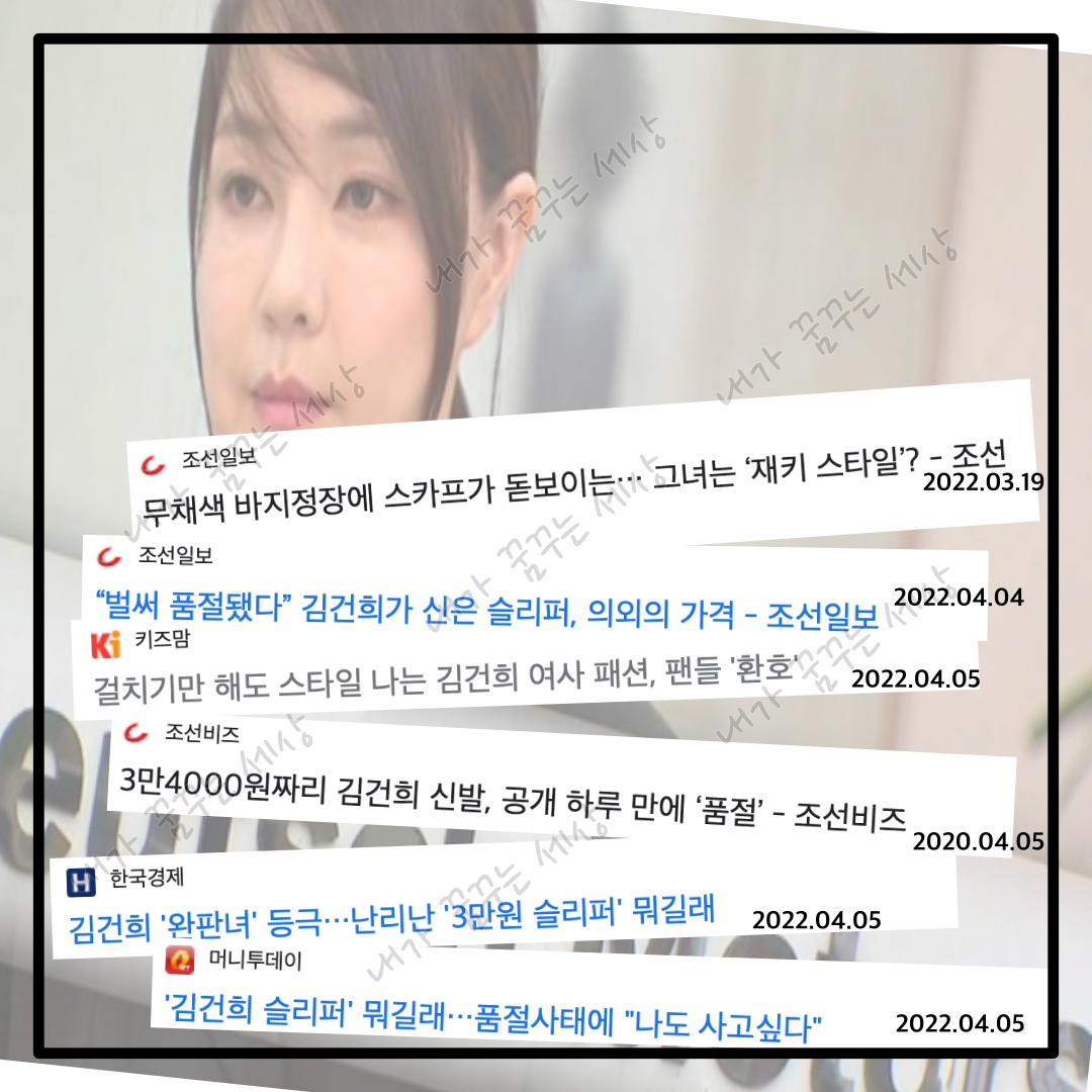 2022년 3월 김건희에 스카프와 스타일에 관심을 가지던 조선은 4월에 드디어 김건희를 완판녀로 만들었다. 이 후부터 많은 언론들은 '김건희 슬리퍼'에 대한 기사을 연일 보도했다. '김건희 슬리퍼' 기사가 도배되기 직전인 4월 1일 도이치모터스 주가 조작 의혹 사건 재판과정에서 권오수 도이치모터스 회장이 김건희씨 계좌를 직접 관리한 정황이 드러났고, 김건희와 주가조작 선수의 연결고리도 나왔다(2022년 4월 1일, 오마이뉴스). 하지만 언론은 김건희의 주가 조작 의혹과 새롭게 밣혀진 사실들 보다는 김건희의 슬리퍼에 더 많은 관심을 가졌다. 그리고 '김건희 슬리퍼 품절', '김건희 완판녀'와 같은 단어로 새로운 이미지를 싣어주기 위해 최선을 다했다.