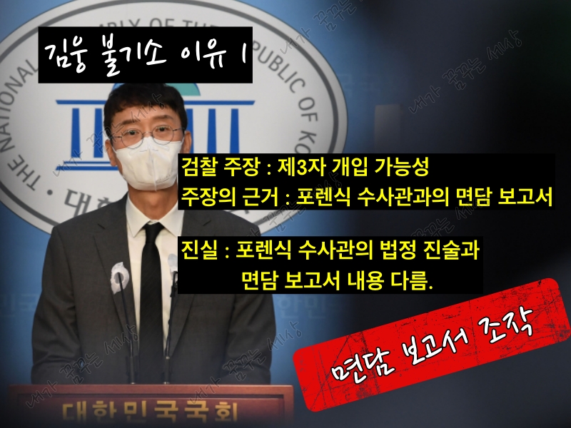 검찰이 조성은의 진술을 왜곡한 이유는 대화 녹음 파일 등을 통해 '선거에 영향을 미칠 의도'가 적나라하게 드러난 상황에서 이를 부인하기 위한 것으로 풀이된다. 조성은의 진술을 왜곡해 김웅을 불구속 기소 이유로 삼았다면 이 또한 허위공문서 작성으로 사건 조작에 해당될 수 있다.