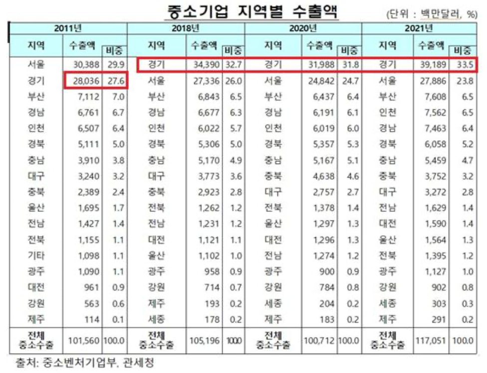 2021년에도 경기도 인구는 대한민국 인구 중 26.9%를 차지하였으나 경기도 수출액은 전체 수출액의 33.5%를 차지함으로써 인구 대비로도 가장 높은 것이다.