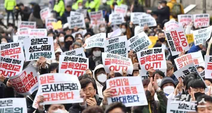 윤석열 대통령처럼 지도자가 친일 사상에 물들어 이런 개떡 같은 협상을 타결했다 해도 국내에 반대파의 힘이 강해질수록 반대파를 설득해야 한다는 문제가 남기 때문이다. 더군다나 지금은 여소야대 상황이다. 민주당의 투쟁력이 영 시원치 않다는 문제는 차치하고서라도 대한민국의 권력은 윤석열 혼자에게 있지 않다는 사실이 정치 지형적으로도 분명하다.