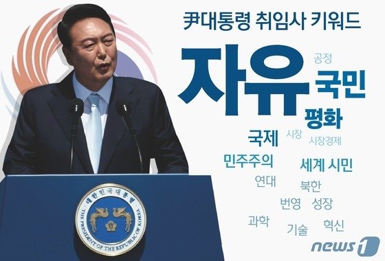 지난 20대 대통령 취임식에서 윤석열을 국민과 자유, 평화 등의 키워드를 강조했다. '국민'은 총 15번 등장했고 '자유민주주의'와 '자유 시민'을 포함해 '자유'는 총 35회를 언급했을 정도다.