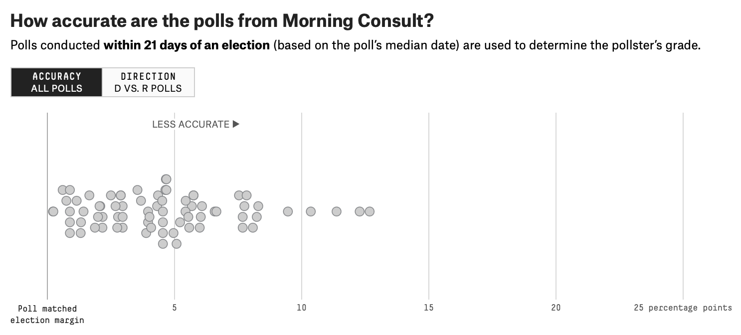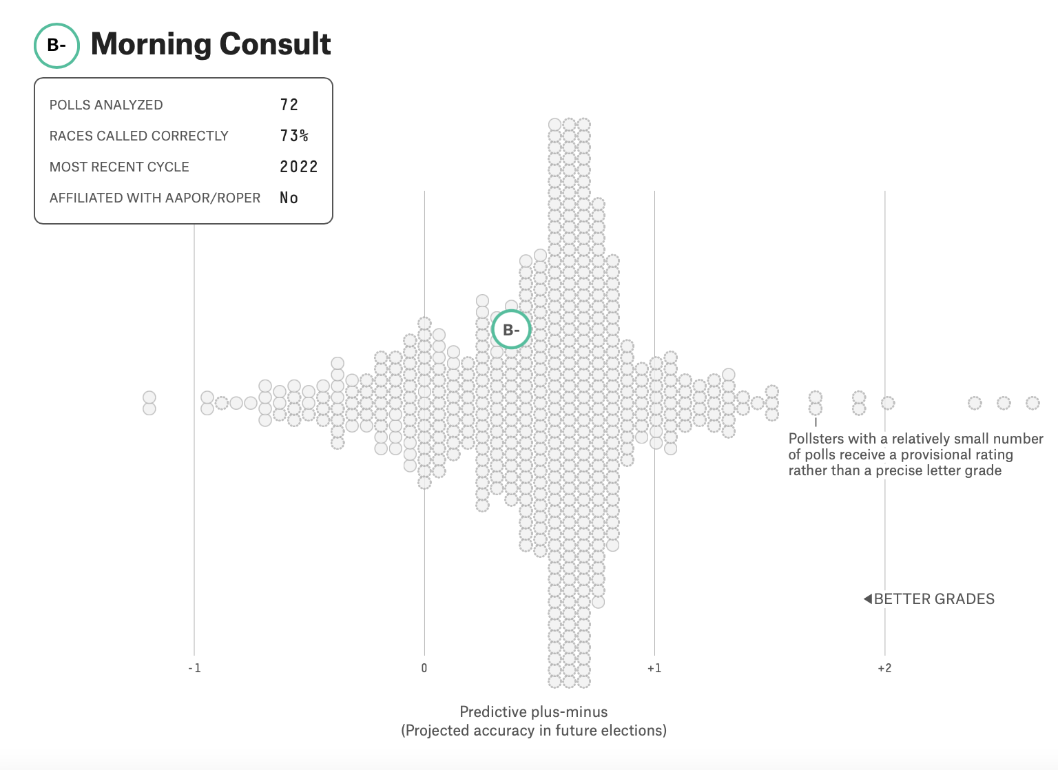 이에 비해 모닝컨설트는 여론조사 정확도를 분석하는 FiveThirthEight's에서 73% 정확도로 'B-' 등급으로 상위 그룹에 속해 있다.