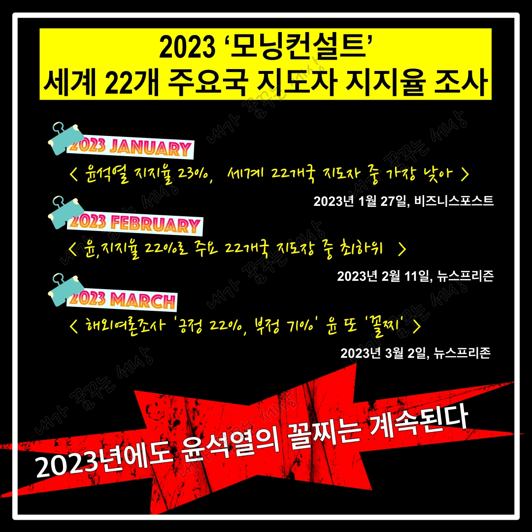 윤석열의 세계 주요국 지도자 지지율 꼴찌는 놀랍지 않다. 하지만 모닝컨설트 지지율과 너무나 차이가 차는 한국의 여론조사 지지율은 놀랍다.