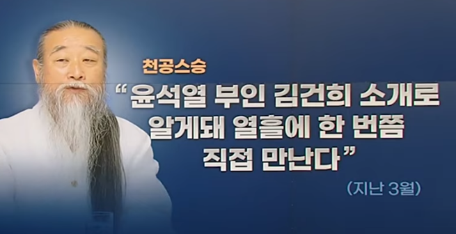 천공과 윤석열에 관계는 대통령 후보시절부터 계속 이야기 되었다. 특히 천공은 윤석열의 멘토냐라는 인터뷰 질문에 "좀 도와주고, 지금도 도와준다"라고 답했다. 이후 천공과 윤석열을 만나게 주선한 사람이 윤석열 부인 김건희라는 것이 밝혀지면서 천공과 윤석열 그리고 김건희의 '무속 논란'이 시작되었다.