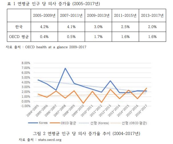 하지만, 실제로 위 <표 1>과 <그림 2> 에서 보듯 한국의 연평균 의사 증가율은 점점 감소해 최근에는