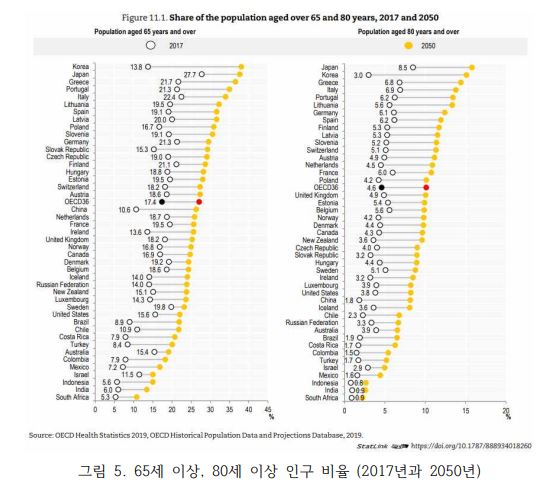한국은 고령화가 세계에서 가장 빠르게 진행되고 있습니다. 2050년이 되면 노인 비중이 세계 최고가