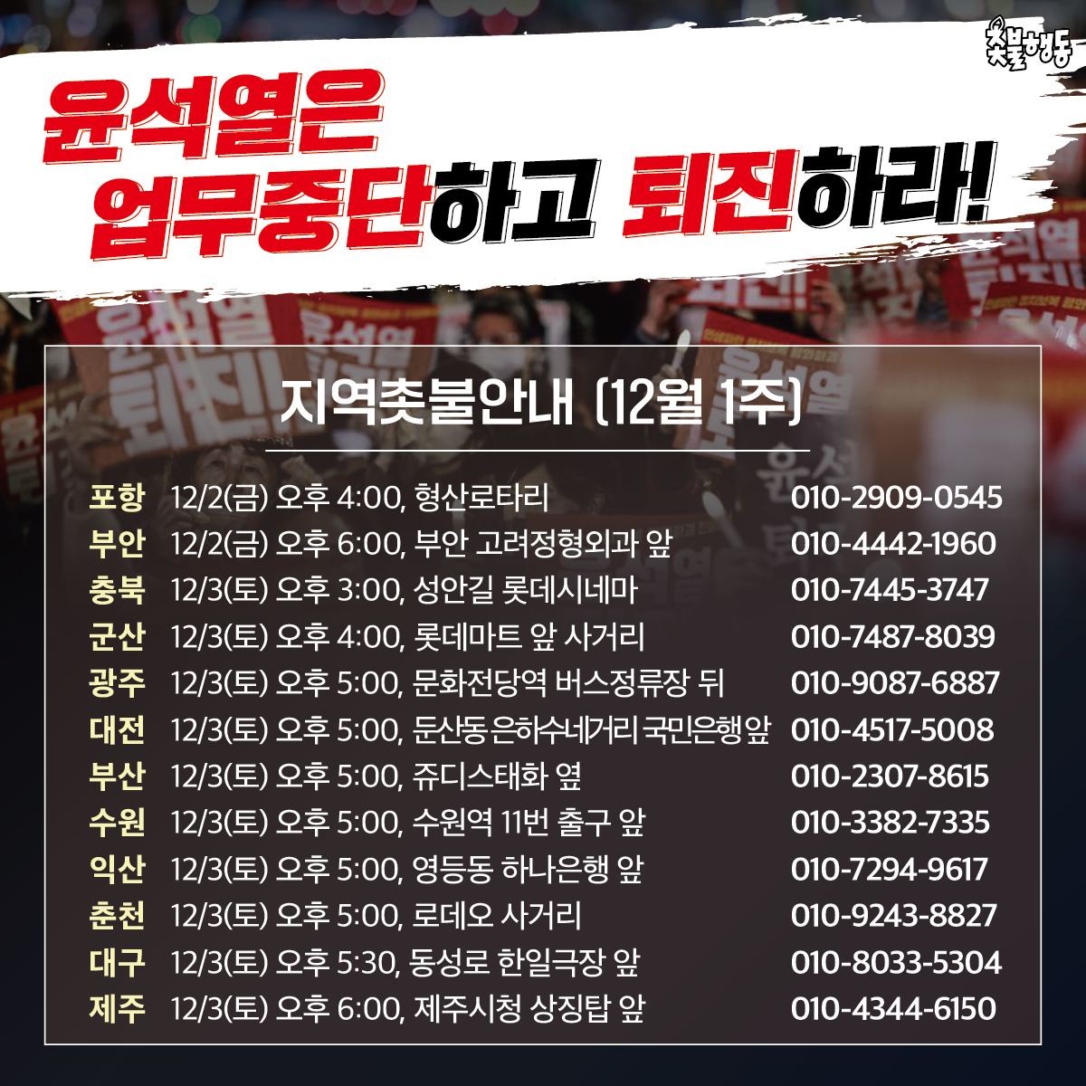 12월 3일에는 서울에서 진행되는 제17차 촛불 대행진 외에도 포항(2일)과 부안(2일), 충북, 군산, 광주, 대전, 부산, 수원, 익산, 춘천, 대구, 제주 등 전국 12개 지역에서도 촛불 대행진이 진행됩니다.
