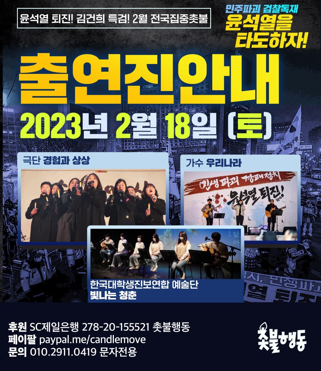 한편, 2월 전국집중촛불 본행사에는 극단 경험과 상상, 가수 우리나라 그리고 한국대학생진보연합 예술단 빛나는 청춘이 출연할 예정입니다.