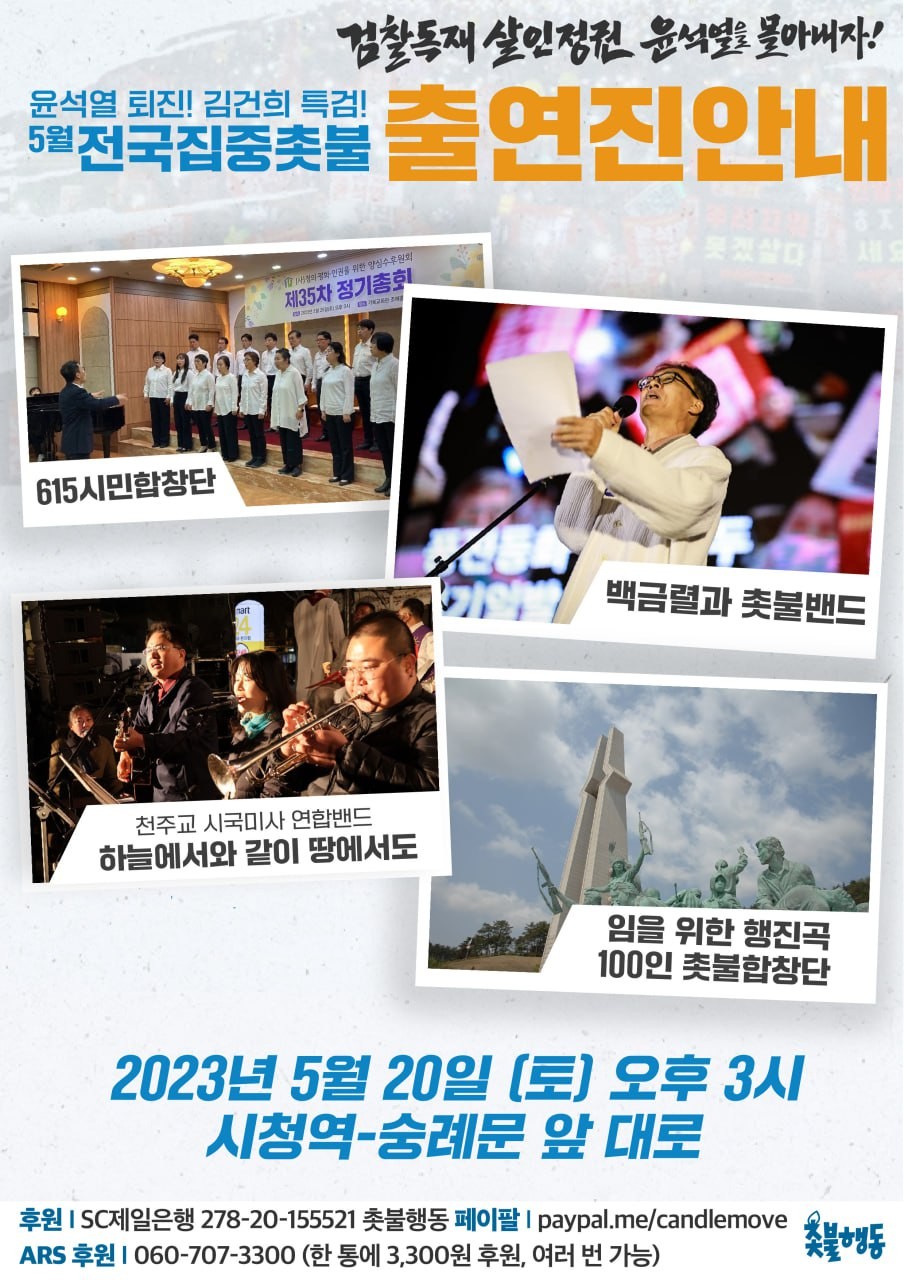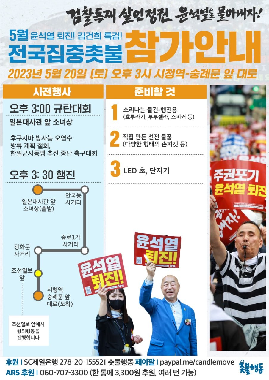2023년 5월 20일 토요일 오후 5시 시청역-숭례문 앞 대로에서 💥검찰독재 살인정권! 윤석열을 몰아내자💥 5월 전국집중촛불 본 행사가 진행됩니다.