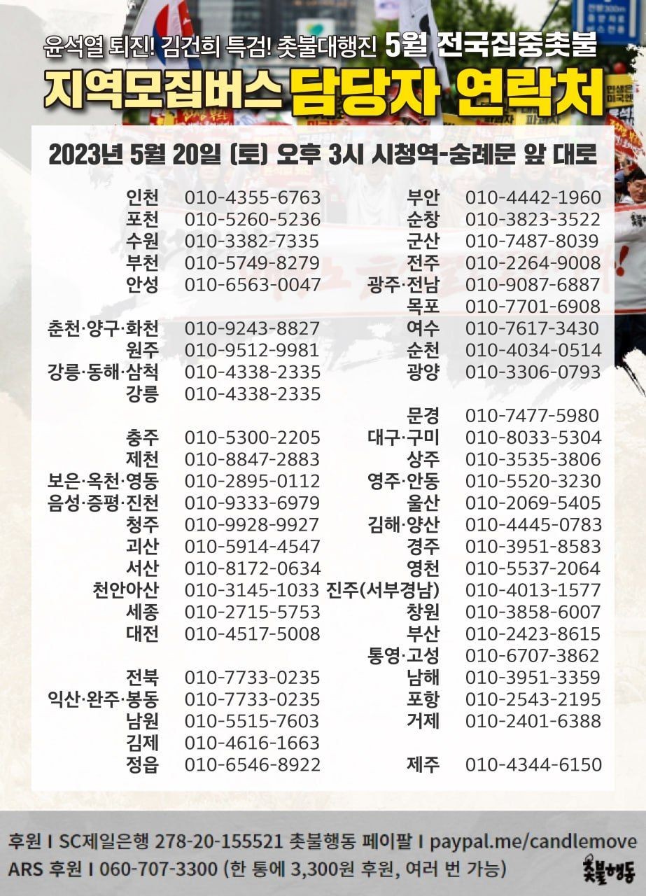 지역모집버스 담당자 연락처도 있으니 해당 지역에서 5월 전국집중촛불에 참석하시고 싶은 분들의 많은 관심 부탁드립니다.