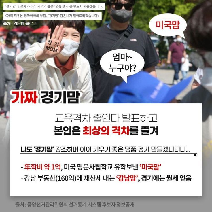 결국 김은혜는 가짜 경기맘을 내세우면서 2백억대 자산은 서울에, 자신의 자녀는 미국에, 명예와 이익은 경기도에서 얻고자 하고 있다.