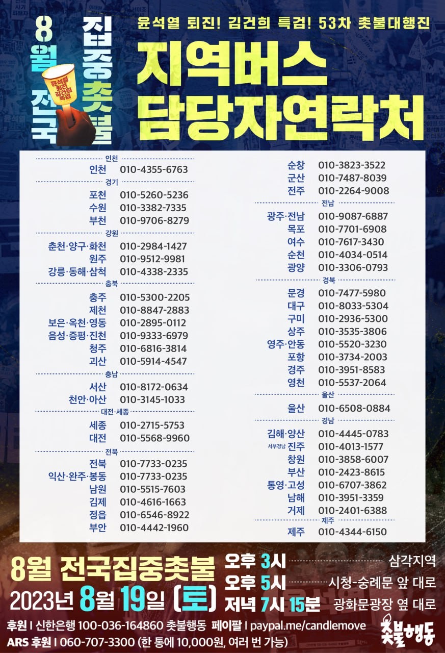 지역모집버스 담당자 연락처도 있으니 해당 지역에서 8월 전국집중촛불에 참석하시고 싶은 분들의 많은 관심 부탁드립니다.