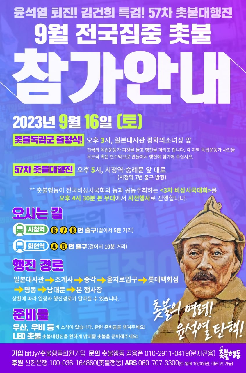 2023년 9월 16일 토요일 오후 5시부터 시청역-숭례문 앞 대로에서 💥촛불의 명령! 윤석열 탄핵!💥 9월 전국집중촛불 본 행사가 진행됩니다.